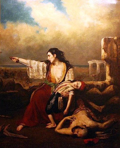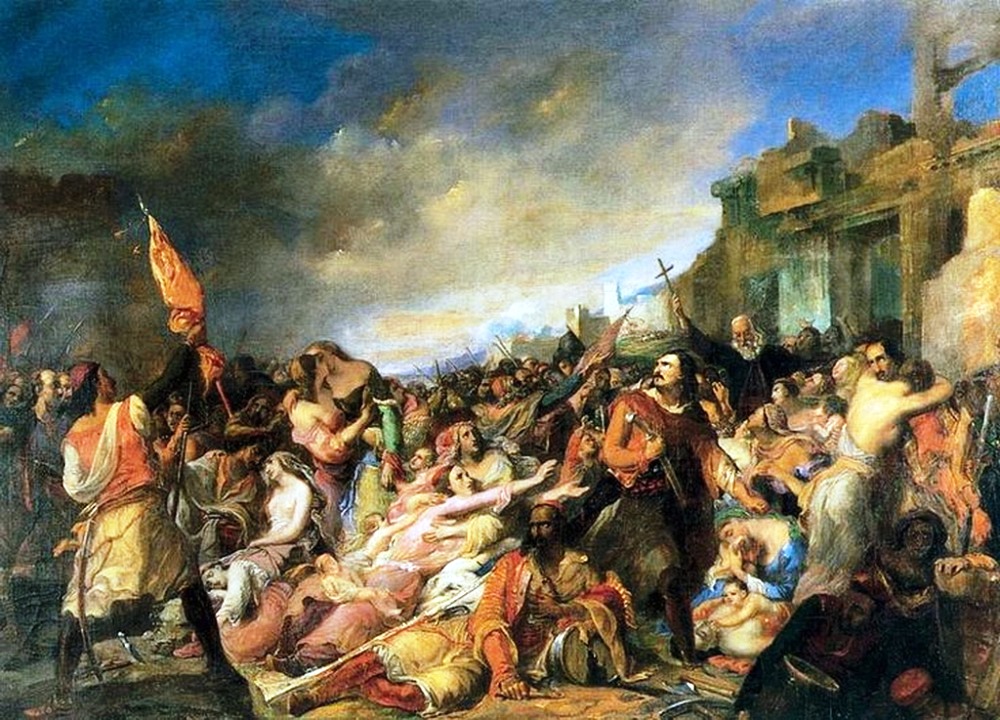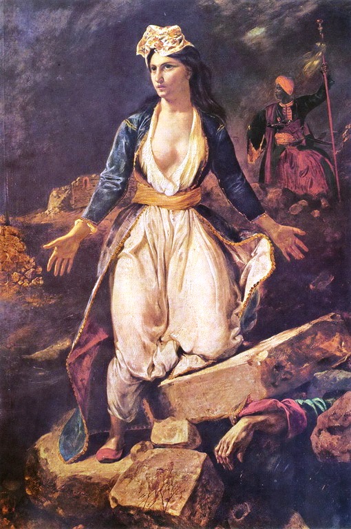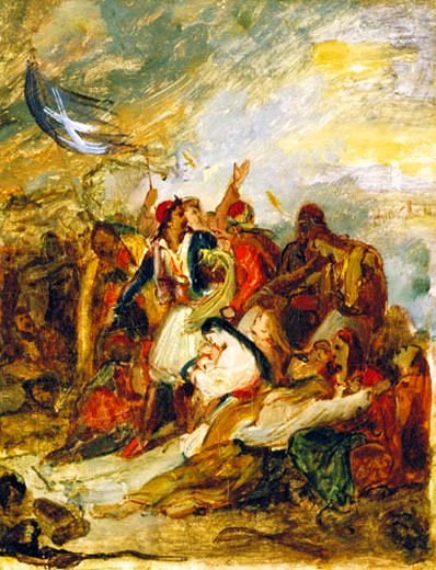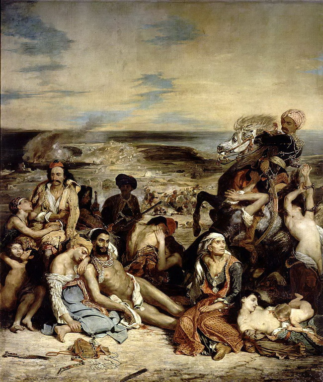 Ο Γάλλος Ντελακρουά (Ferdinard Victor Eugene Delacroix 26/3/1798- 13/8/1863) ήταν ένας μεγάλος πρεσβευτής της Ελληνικής Επανάστασης, παρόλο που δεν είχε επισκεφτεί ποτέ την Ελλάδα. Η επαφή του με τα τεκταινόμενα στην Ελλάδα ήταν μέσα από την φιλία του με τον λόρδο Βύρωνα. Ζωγράφιζε Ελληνικά θέματα και μετά την απελευθέρωση. Το κορυφαίο έργο του «Η σφαγή της Χίου» το 1824, βασίστηκε στα «Απομνημονεύματα» του συνταγματάρχη Voutier το 1823. Η σφαγή της Χίου έγινε στις 11 Μαρτίου του 1822. Οι 7000 άντρες του Οθωμανικού στρατού που αποβιβάστηκε στο νησί έκαψαν όλα τα σπίτια, σκότωσαν όλα τα παιδιά κάτω από 3 ετών, όλους τους άντρες από 12 ετών και πάνω και όλες τις γυναίκες από 40 ετών και πάνω με εξαίρεση όσους θα ασπάζονταν βιαίως το Ισλάμ. Συνολικά, πάνω από 40.000 Έλληνες σφαγιάστηκαν και αιχμαλωτίστηκαν! Με το έργο του αυτό ο Ντελακρουά αναστάτωσε όλο το Παρίσι, ξύπνησε συνειδήσεις και προσέφερε μεγάλη βοήθεια στον αγώνα των Ελλήνων, σε μια εποχή που δεν υπήρχε ακόμη αναπτυγμένη η δημοσιογραφία.