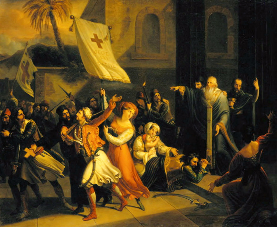 Τους κατοίκους του Μεσολογγίου, της Χίου και γενικότερα τους Έλληνες που βασανίζονταν, σφάζονταν ή οδηγούνταν στα δουλοπάζαρα από τους τούρκους, η Ευρωπαϊκή κοινή γνώμη τους έβλεπε ως τους νεομάρτυρες της χριστιανικής πίστης. Τα φιλελληνικά έργα έδωσαν ιδιαίτερη έμφαση στον χριστιανικό χαρακτήρα. Ενώ μια νέα θεματογραφία προέκυψε που την χαρακτήριζε η έμφαση σε ιερατικά μοτίβα. Στην σφαγή της Χίου του Ρώσου Ξιντάκομπ, ο ιερέας μάχεται με το σύμβολο του σταυρού στο χέρι του ως ο τελευταίος και υπέρτατος υπερασπιστής της πίστης και της ελευθερίας. Τέτοιες σκηνές άναβαν φωτιές στις καρδιές των χριστιανών της Ευρώπης. Συχνά τα ιστορικά γεγονότα συνυφαίνονται με κάποιο προσωπικό δράμα όπως τον πίνακα του Ary Scheffer «Νεαρός έλληνας που υπερασπίζεται τον πληγωμένο πατέρα του» και ανδρώνεται μέσα στη μάχη.