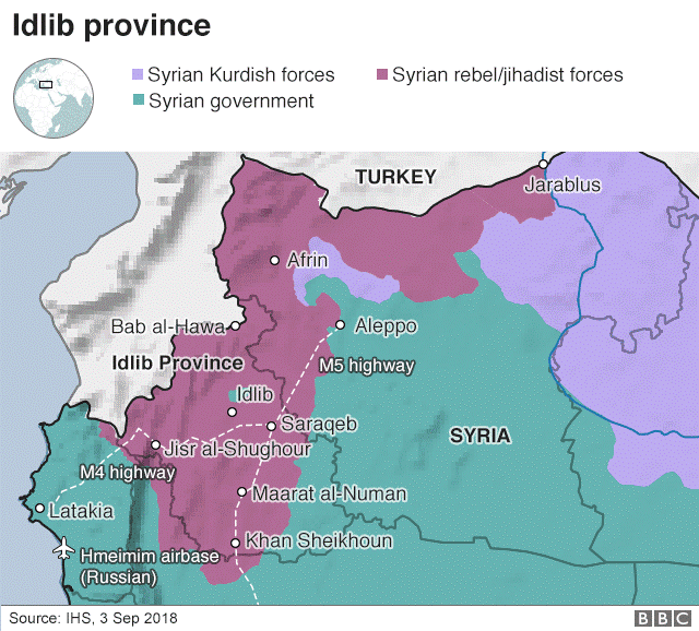 Ο μεγάλος νικητής του πολέμου στην Συρία είναι η Ρωσία, που από μια μικρή ανεφοδιαστική ναυτική βάση στην Ταρτούς που είχε, με την παρέμβασή τουστην Συρία κατέστη ο παράγοντας της νίκης και μιας μεγάλης προβολής ισχύος, που ποτέ δεν είχε. Διαθέτει μία μεγάλη ναυτική βάση και μια πολύ μεγάλη αεροπορική βάση, καθώς και άλλες μικρότερες. Συμφωνεί με τις επιχειρήσεις κατά της Ιντλίμπ, για την εξάλειψη των τζιχαντιστών και την απελευθέρωση της περιοχής και μάλιστα ήλθε σε αντίθεση με τον «σύμμαχό» του Ερντογάν, πρόσφατα στην τριμερή της Τεχεράνης. Οι λόγοι είναι πολλοί. Η περιοχή Δυτικά του Ευφράτη ανήκει στην επιρροή της Ρωσίας, σύμφωνα με συμφωνία ΗΠΑ-Ρωσίας. Άρα δεν επιθυμεί να έχει στην περιοχή επιρροής της μια τεράστια σφηκοφωλιά50.000 καλά εξοπλισμένων τζιχαντιστών, πηγή συνεχών κινδύνων. Δείτε τον χάρτη που βρίσκεται η Ιντλίμπ και κάτω από την περιοχή αυτή σε απόσταση μερικών δεκάδων χιλιομέτρων ευρίσκονται οι δύο μεγάλες βάσεις των, άρα δεν θα επιτρέψουν ποτέ να υφίσταται η μεγάλη αυτή πηγή κινδύνων. Αεροπορική βάση Bassel Assad και λιμάνι Ταρτούς. Οι δυο σημαντικότερες στρατιωτικές βάσεις της Ρωσίας στη Συρία βρίσκονται που κοντά στην Ιμπλίμπ.Σε ότι αφορά την ενδεχόμενη χρήση χημικών, καταγγέλλει τις ΗΠΑ και την Δύση, ότι αυτοί ετοιμάζουν προβοκάτσια για να κτυπήσουν την Συρία και να ματαιώσουν την ανακατάληψη της Ιντλίμπ, όπως έχειαποφασιστεί (Ρωσία, Συρία, Ιράν) και ότι η Ρωσία θα συμμετάσχει. (5 )