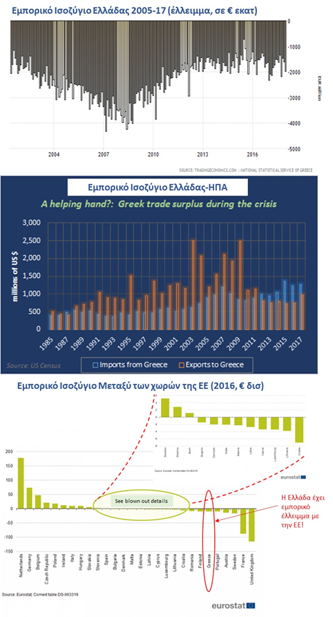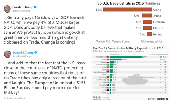 Η Γερμανία μπορεί να μην ξοδεύει όσα ζητά το ΝΑΤΟ σε εξοπλισμούς και να έχει άλλες προτεραιότητες αλλά από την άλλη εξάγει εξοπλισμούς στην Ελλάδα και επενδύει στην βιομηχανία και τον πλουτισμό από εξαγωγές προϊόντων. Έτσι το εμπορικό έλλειμα των ΗΠΑ με την ΕΕ είναι $151 δις με την Γερμανία να αποτελεί την χώρα με το μεγαλύτερο πλεόνασμα στην ΕΕ $65 δις). Οι εισαγωγές από την Γερμανία έχουν γίνει τώρα μοχλός πίεσης των ΗΠΑ προς την Γερμανία (απειλώντας την με την επιβολή δασμών) για την εκπλήρωση των υποχρεώσεών της στο ΝΑΤΟ. Δηλαδή «δούναι και λαβείν». Η συζήτηση περί δασμών περιστρέφεται στα αυτοκίνητα τα οποία είναι το μεγαλύτερο μέρος των του εμπορικού ελλείματος των ΗΠΑ και πιθανότατα μεγάλο μέρος αυτού αφορά Γερμανικά αυτοκίνητα τα οποία επωφελούνται από το Ευρώ το οποίο ειδήμονες θεωρούν ότι είναι σε χαμηλότερη ισοτιμία απ’ότι θα ήταν το Μάρκο μιας ανεξάρτητης Γερμανίας.