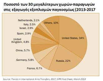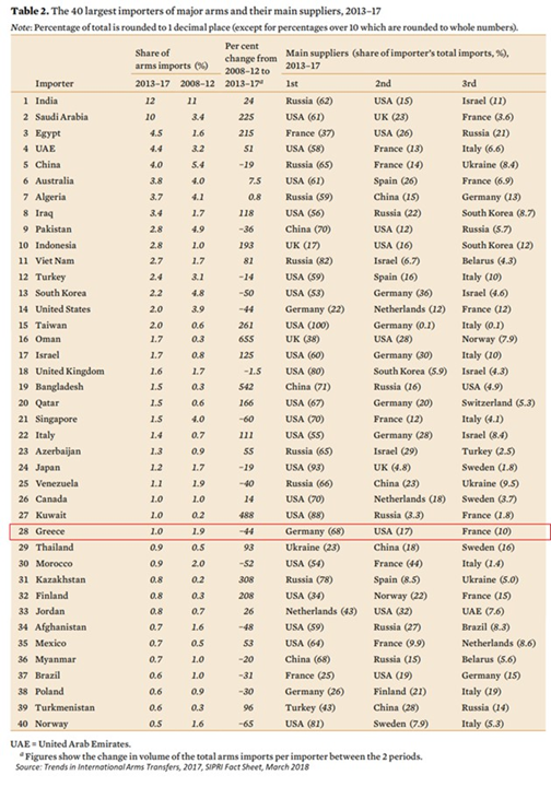 Η Ελλάδα είναι 28ος μεγαλύτερος εισαγωγέων όπλων την περίοδο 2013-2017 δηλ. μέσα στην κρίση, με ποσοστό 1% στη συνολική αγορά από 1.9% και την 14η θέση μεταξύ 2008-2012. Οι αγορές της Ελλάδας την περίοδο αυτή των μνημονίων είναι κυρίως από τη Γερμανία (68%!) και ακολουθούν οι ΗΠΑ (17%) και η Γαλλία (10%). Η Ελλάδα αποτελεί τον 2ο μεγαλύτερο πελάτη της Γερμανίας με το 11% των πωλήσεών της! (Source: Trends in International Arms Transfers, 2017, SIPRI Fact Sheet, March 2018)