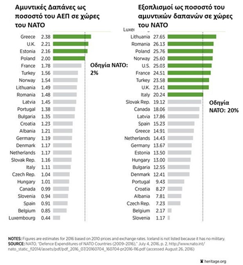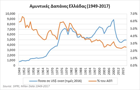 Οι Ελληνικές αμυντικές δαπάνες ανέρχονται στο 2,4% του ΑΕΠ, δηλ. $5,8 δισ (ή περίπου €5δις) το 2017. Οι δαπάνες αυξήθηκαν σημαντικά κατά την περίοδο του Ευρώ, όπως και τόσα άλλα και προφανώς αποτελούν μέρος του χρέους πια.