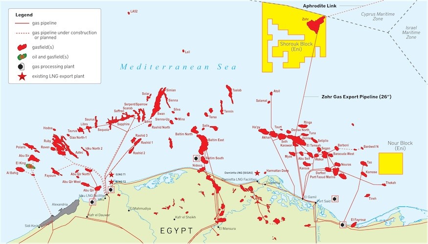 Εκμεταλλευόμενη τα δύο εργοστάσια υγροποίησης στο Idku και στην Damietta (Σχήμα 8 – πράσινοι κύκλοι) και το δίκτυο αγωγών που υπάρχει και αναπτύσσεται, θα μπορεί να το υγροποιεί και να το εξάγει εύκολα προς την διψασμένη για ενέργεια Ευρώπη. Αν και το κοίτασμα Zohr ήδη έχει αναπτυχθεί και παράγει, εν τούτοις όλα αυτά τα έργα απειλούνται από την μείωση της ζήτησης, καθώς και από τις υγειονομικές επιπτώσεις που θα φέρει ο κορωνοϊός στους εργαζόμενους. Η μείωση της ζήτησης -αν συνεχιστεί- θα αναστείλει πιθανές επενδύσεις για την περαιτέρω ανάπτυξη και τα προγραμματιζόμενα έργα αν δεν ανασταλούν τουλάχιστον θα καθυστερήσουν (αν και οι επιπτώσεις στις επενδύσεις στο αέριο είναι μικρότερες από τις αντίστοιχες του πετρελαίου που έχουν ισχυρότερο περιβαλλοντικό αποτύπωμα). Η επίδραση του κορωνοϊού σήμερα στην Αίγυπτο είναι μικρή και αυτό εξασφαλίζει την υγεία τουλάχιστον των εργαζομένων στον τομέα.
